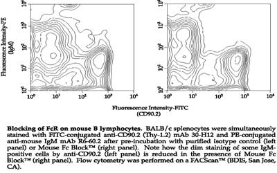 使用未偶联的大鼠抗小鼠一抗或小鼠抗大鼠一抗,并在存在BD Fc封闭剂的情况下进行实验时,必须精心设计。所选择的二抗试剂不得与BD Fc封闭剂、大鼠IgG 2b或小鼠IgG 1发生交叉反应。培镨生物提供了一系列同种型特异性抗大鼠和抗小鼠免疫球蛋白单克隆抗体,可用于此目的。