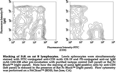 在使用特异性抗体进行染色之前,将小鼠或大鼠细胞悬液与相应的BD Fc封闭剂预孵育几分钟,可确保所观察到的染色是由抗体的抗原结合部分与细胞表面抗原的相互作用引起的。以下图片展示了小鼠和大鼠BD Fc封闭剂的典型应用。