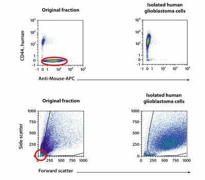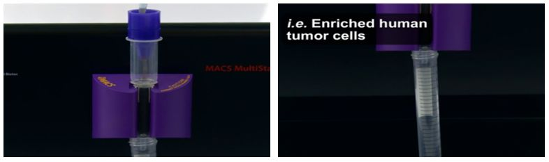(2) 将细胞与标记小鼠细胞的磁珠混合,放置2−8 °C的冰箱孵育15分钟。加入适当体积缓冲液,上样于分离柱。无标记的细胞先流出,此即为目标人源肿瘤细胞 (untouched tumor cells)。可利用缓冲液额外清洗管柱,已获得更多的肿瘤细胞量。
