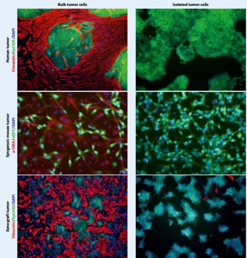 PDX在给药处理一段时间后会取出肿瘤做实验下游分析,如抽取tumor DNA进行NGS,使用流式细胞仪分析肿瘤细胞表征,甚至体外细胞培养进行药物敏感性测试。然而此时人源肿瘤组织周边会混和着不定程度鼠源的间质细胞 (stroma cells) 、周细胞 (pericyte)、甚至有血管增生。这些浸润混合的鼠源” 污染细胞” 对人源肿瘤组织产生更多非必要的异质性与造成实验结果偏差。因此,能有效地从患者衍生的异种移植肿瘤去除小鼠细胞是PDX model下游分析或培养应用一重大环节。