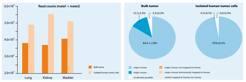 (4) 分离后的人源肿瘤细胞执行RNA-Seq,明显获得更多可信的读值 (Read counts)