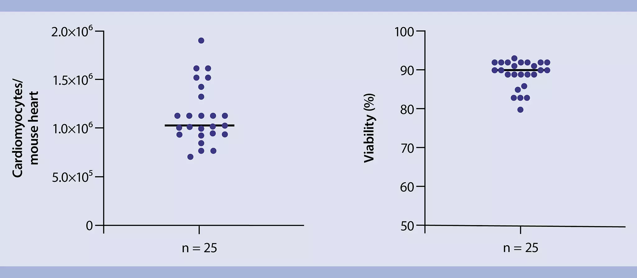 心肌细胞产量以每只小鼠心脏的总产量来表示。为了测定细胞活力,用PI对细胞进行染色,并直接用MACSQuantAnalyzer进行分析(n=25,C57BL/6)。