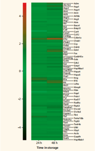 分子分析的一个主要关注点是,贮藏条件诱导细胞应激和基因表达的变化。这是通过分析与细胞应激通路相关的基因的表达来研究的。将保存的样品与新鲜样品的基因表达量进行比较。保存24或48小时后,细胞应激相关基因的表达没有明显变化,基因表达与新鲜样本的细胞相当(图2)。