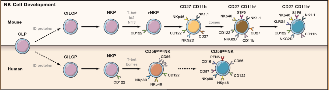 CD3−CD56+NK细胞在机体内由CD34+造血祖细胞(HPC)发育而来,是一个连续的过程,共同淋巴细胞祖细胞(CLPs)逐渐下调CD34,上调CD56,促使NK细胞分化与成熟。在小鼠中,CLP产生共同的ILC前体(CILCP),可产生NK细胞和辅助性ILC,但不能产生LTi细胞。从CILCPs中,NK细胞发育至少包括五个其他阶段:NK祖细胞(NKP)、refined-NKP(rNKP)、CD27+CD11b−NK、CD27+CD11b+NK和CD27−CD11b+NK。CD122的表达是在NKP的下游,意谓进入rNKP阶段。NKP的维持和发育需要转录因子T-bet、Id2和Nfil3,而Eomes的表达是在后期诱导的。未成熟的CD27+CD11b-NK细胞表达活化受体NK1.1、NKG2D和NKp46。它们进一步分化为CD27+CD11b+NK细胞,并表达S1P5,使其从骨髓向外周排出。成熟的CD27−CD11b+NK细胞通过表达抑制性细胞表面受体KLRG1终止其分化。