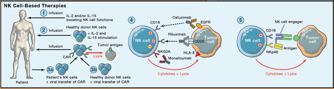 依据NK细胞的抗肿瘤特性,目前已经开发了几种细胞治疗策略。(1)细胞因子:IL-2和IL-15,已知可提高机体内NK细胞活性,但之后潜在恶化的免疫反应是一个安全问题。(2)活化的NK细胞:将健康捐赠者的NK细胞在体外以IL-2和IL-15刺激后,再输住到癌症患者的血液中。这种策略可以利用供者KIR与患者人类白细胞抗原(HLA)的不匹配性,降低NK细胞功能的抑制,提高其抗肿瘤活性。(3)基因工程化NK细胞:自体(3a)或HLA不匹配(3b)嵌合抗原受体(CAR)NK细胞转基因表达抗B细胞恶性肿瘤的抗CD19或抗CD20受体,IL-2和IL-15增强NK细胞存活,或NKG2D提高肿瘤识别和溶解等不同治疗策略均正在临床试验进行中。(4)单克隆抗体:针对肿瘤相关抗原的治疗性抗体,如分别识别CD20和EGF受体的利妥昔单抗或西妥昔单抗,可通过NK细胞诱导ADCC。针对抑制分子的抗体,如识别NKG2A的单抗,可增强NK细胞的反应。调控NK细胞检查点的大分子药物亦正在开发中。(5)NK细胞衔接器:靶向肿瘤抗原(如CD19、CD20或EGFR)、NKp46和CD16的多功能抗体将肿瘤细胞和NK细胞结合在一起,从而触发毒杀肿瘤细胞机制和促进NK细胞分泌细胞因子。