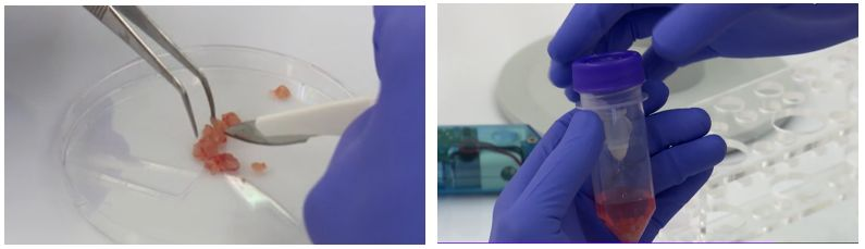 (1) 自小鼠体内取出人源肿瘤,将脂肪、纤维与坏死区域先去除;并切割成2–4 mm大小。转移小碎片的肿瘤组织到含有消化酶的gentleMACS C Tube。