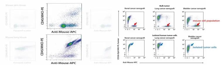 (1) 使用独特的小鼠细胞分子标记(CD45/ HMCI)组合,可在人源肿瘤组织来源移植瘤模型(PDX)去除绝大部份小鼠细胞。