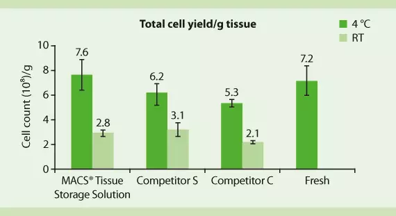 图1.MACS组织储存液与竞争产品每克组织的细胞数比较。