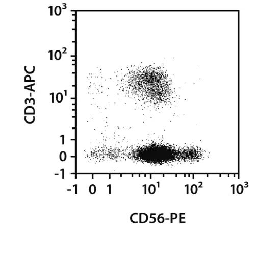 CD56抗原在大多数NK细胞和一小部分T细胞中表达。活化NK细胞后,CD56的表面表达增加。