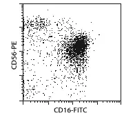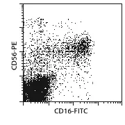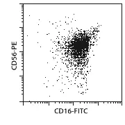 使用CD56+CD16+ NK细胞分离试剂盒,LS和MS柱,midiMACS™和MiniMACS™分离器从人外周血中分离CD56+CD16+ NK细胞。细胞用CD16-FITC和CD56-PE进行荧光染色。