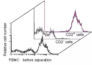 用CD2 MicroBeads标记pbmc。为了进行阳性选择,使用MiniMACS™分离器在分选柱上分离细胞。去除分选则可选择使用在MidiMACS™分离器的LD柱上进行CD2+细胞分离。