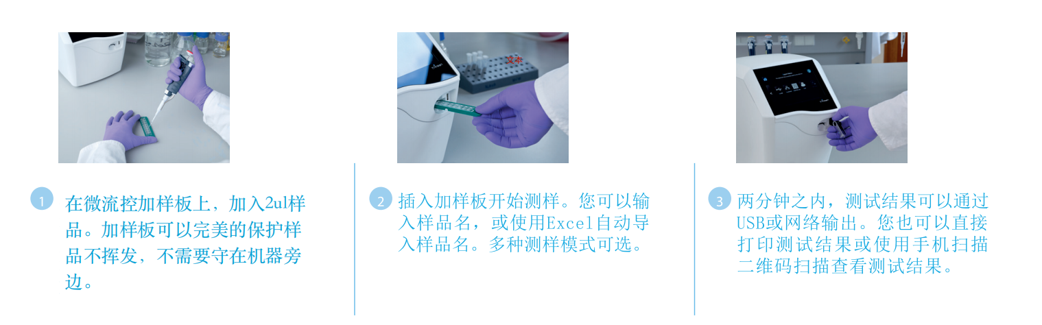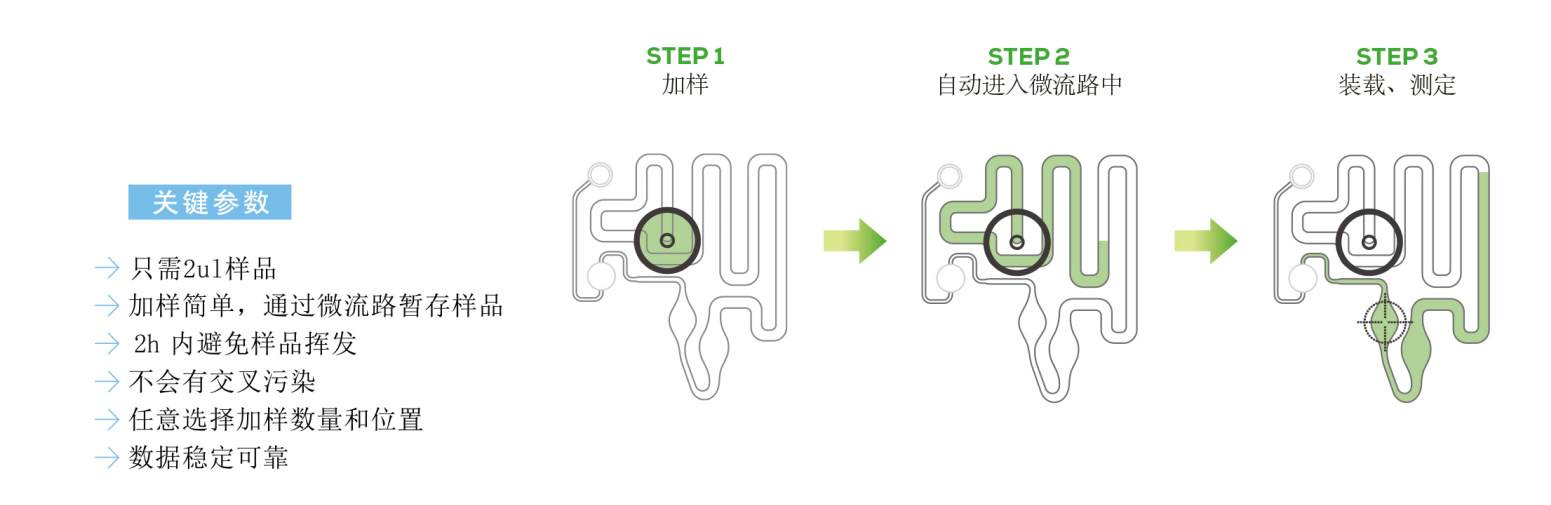 Lunatic Chip 加样板独特的微流控流路上,您只需要加2μl 的样品。不需要担心样品挥发导致浓度变化,这样您可以成批加样。插入加样板点击测量即可。不需要清洁擦拭,没有残留。